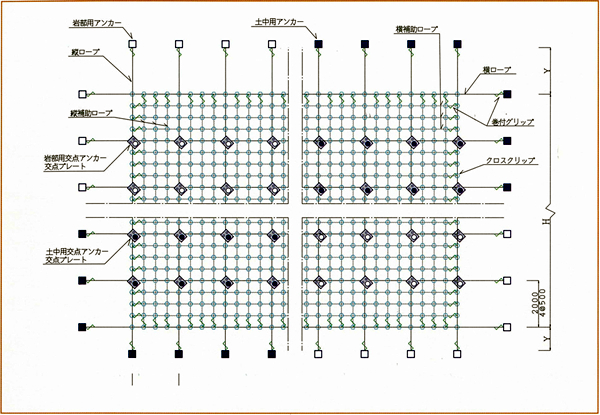立木を残しワイヤーロープを、格子状に設置します。最小限の支障木(小木・雑木)の伐採及び草類の刈り取り程度で施工ができ、自然を残せます。 - 斜面が安定します