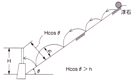 - 落石の跳躍量(h)は、一般的に2m以下であるといわれていますが、斜面の凹凸が大きい場合跳躍量は2m以上と成ることがあります。特に落下高さが大きい時には4~5mに達することもあります。斜面の状況に注意して下さい。なお、法尻平坦部の広さ、斜面の凹凸の状況等、斜面の特性によっては棚高の高いものを選定しなければならない場合もあります。棚の高さは棚設置位置の棚上端からの仰角が45度以下となるように決めて下さい。