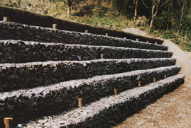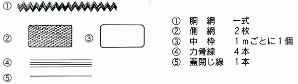 箱状のかごで、銅網、ふた網、中枠、骨線及び閉じ線からなります。