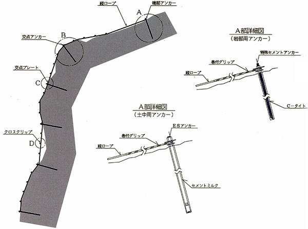 立木を残しワイヤーロープを、格子状に設置します。最小限の支障木(小木・雑木)の伐採及び草類の刈り取り程度で施工ができ、自然を残せます。 - 斜面が安定します