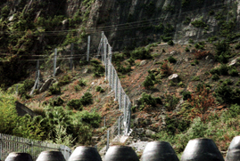 ロープの弾性伸びと鋼材の支柱の塑性変形でエネルギーを吸収しますので比較的大きな落石エネルギーを対応します。